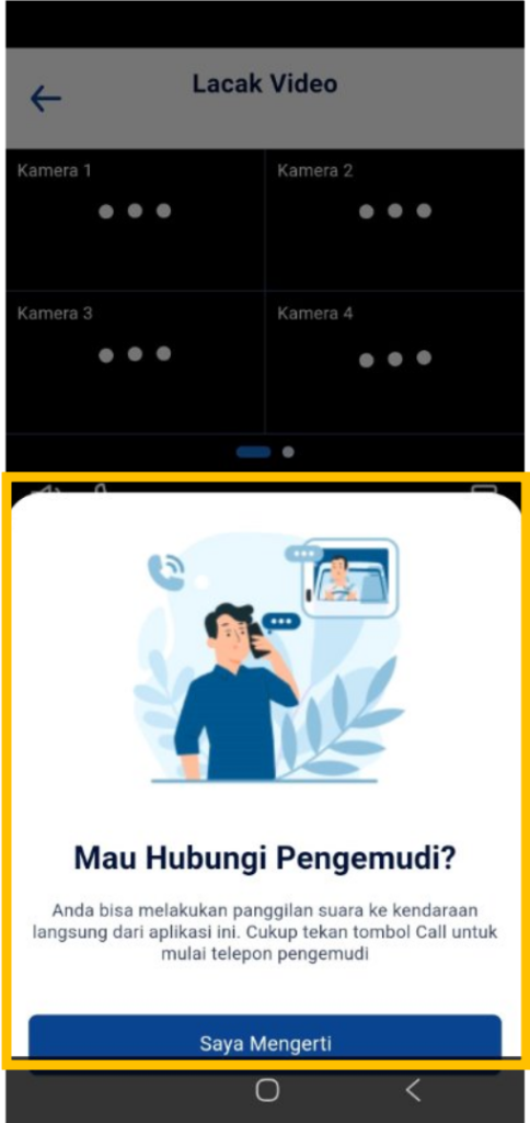 Step 1: Ketika akses lacak video maka akan mucul pop up informasi bahwa user dapat langsung menghubungi pengemudi dan dapat di klik “Saya Mengerti”
