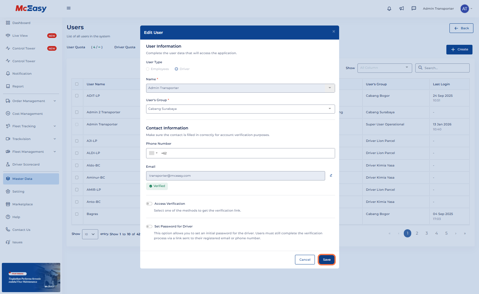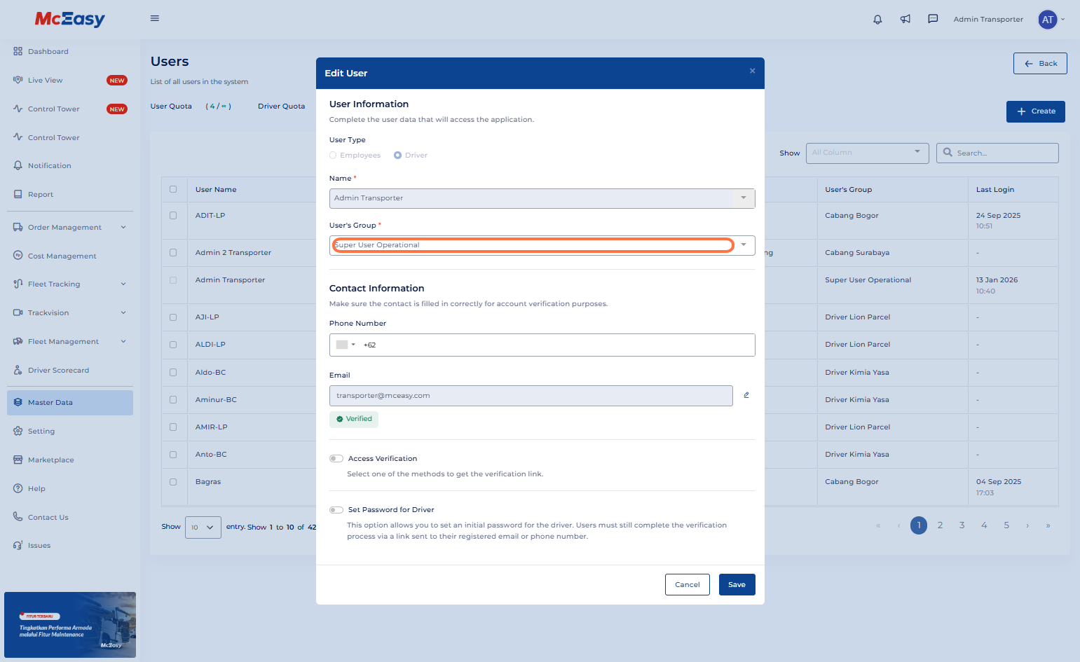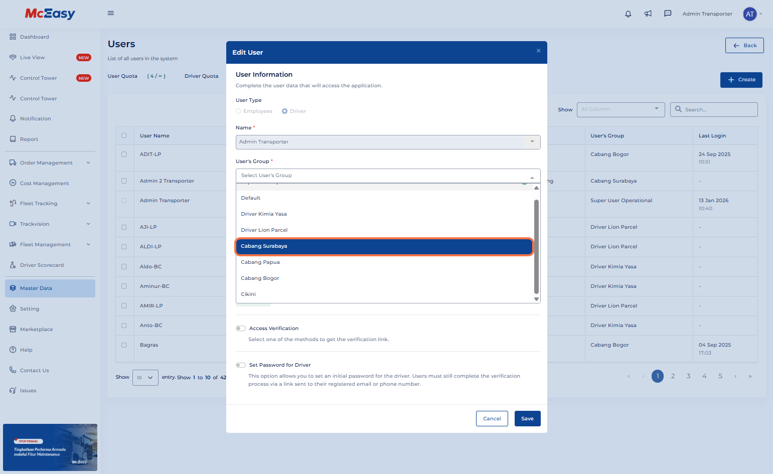- Master Data: Hanya akan menampilkan user dengan cabang yang sesuai dengan User Group baru
