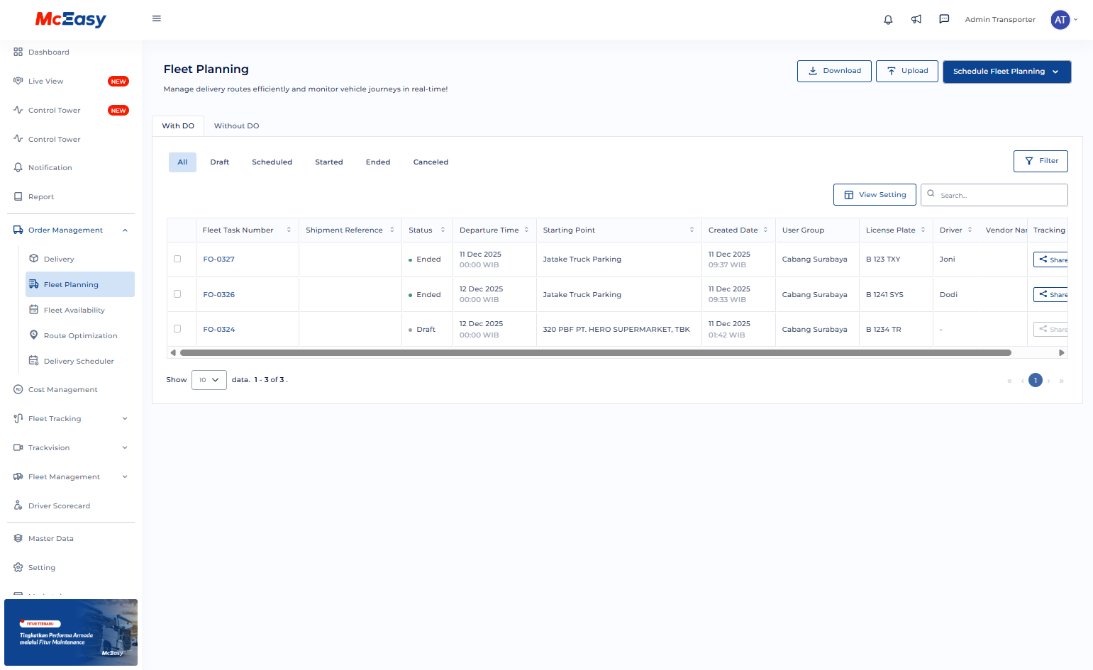- Fleet Planning: Fleet Order (FO) hanya menampilkan data dari cabang user sesuai User Group yang ditentukan