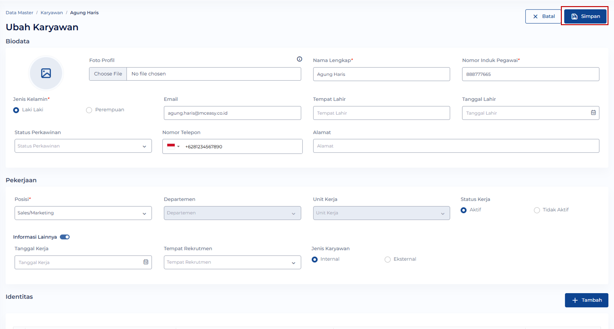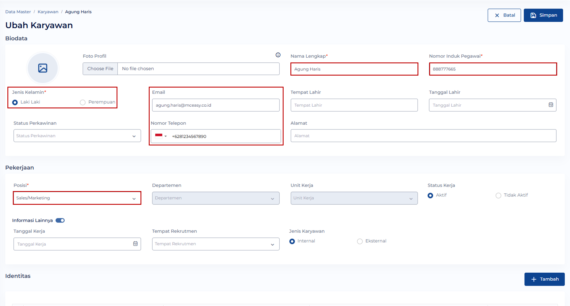 - Melengkapi kolom isian wajib yaitu Nama Lengkap, Nomor Induk Pegawai, Jenis Kelamin, Email atau Nomor Telepon, dan Posisi. Kemudian klik tombol