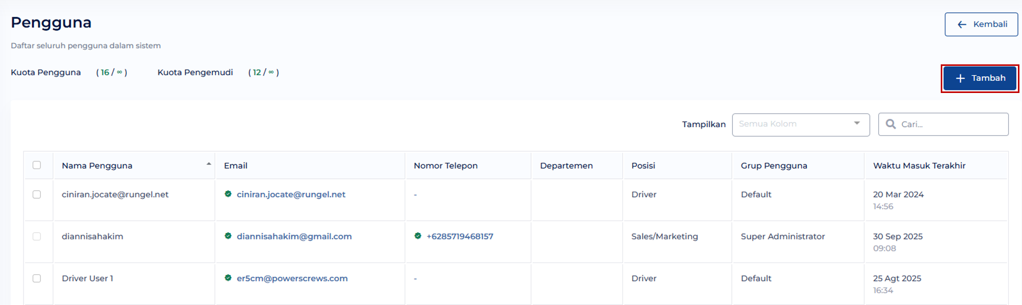 - Pengguna baru yang telah melakukan atur kata sandi atau verifikasi, pada master data pengguna akan memiliki tanda
