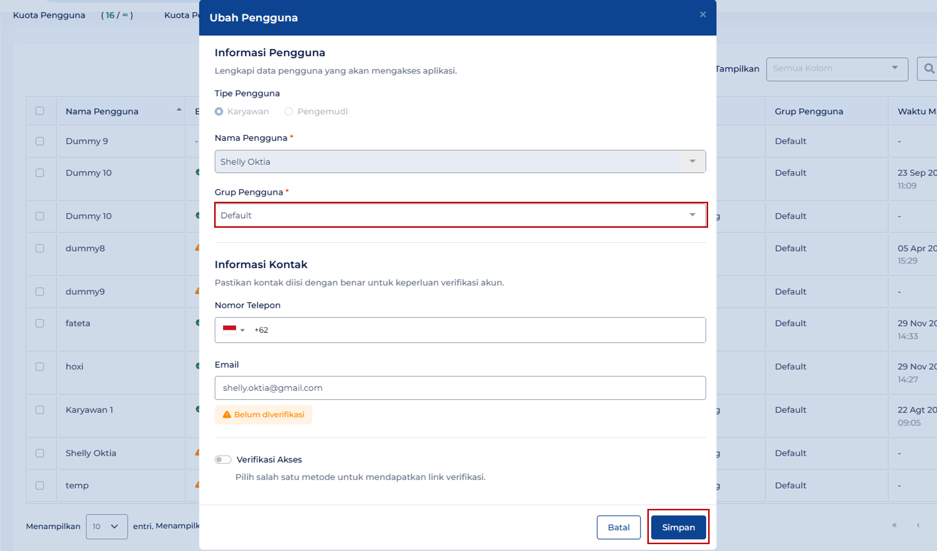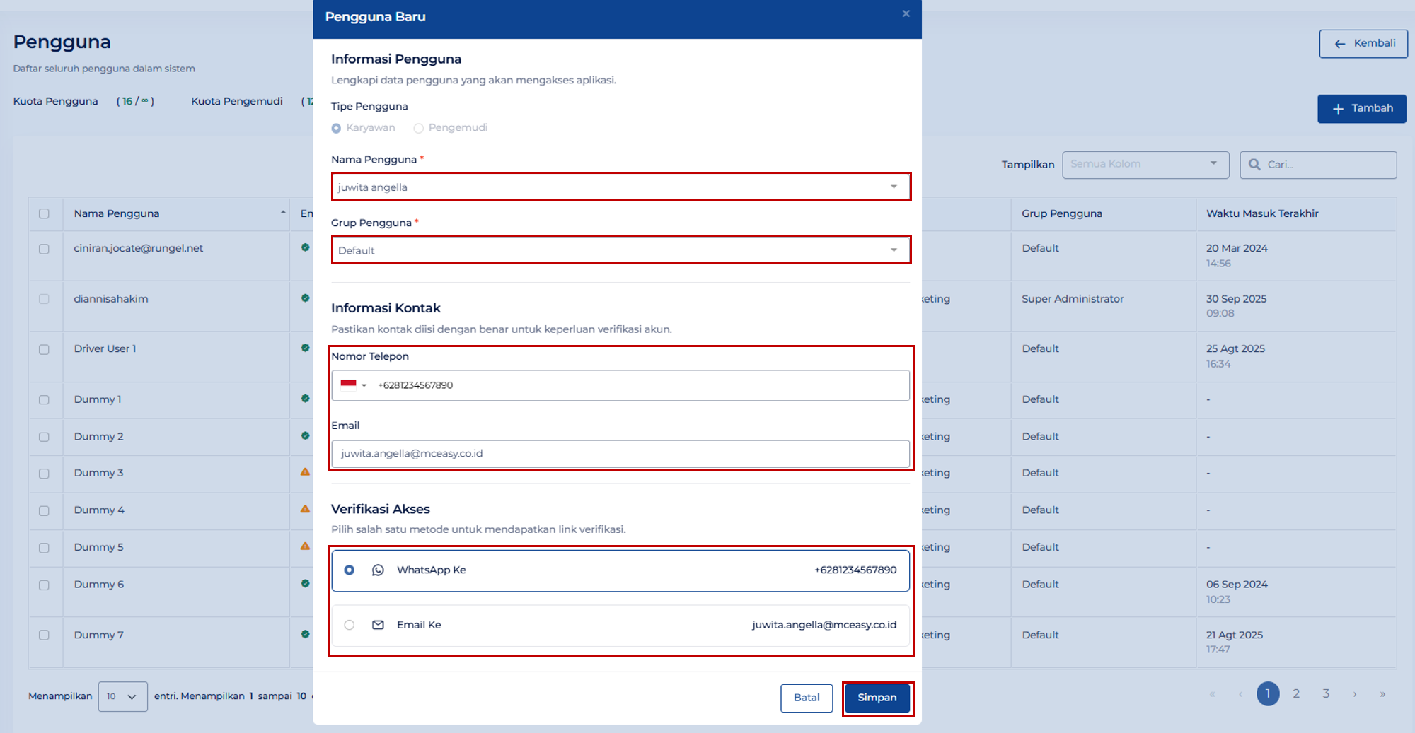 - Melengkapi kolom isian Nama, Grup Pengguna, Informasi Kontak dan Verifikasi Akses.