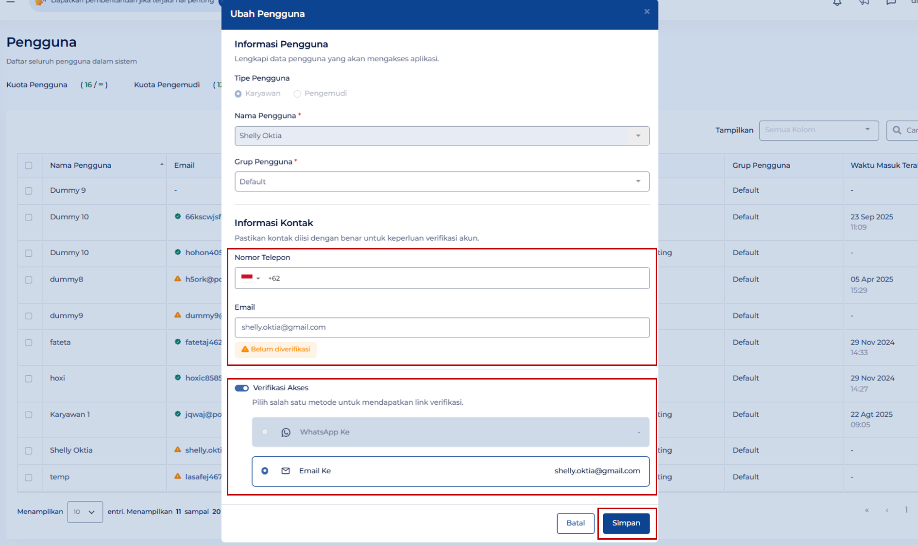 - Klik pada salah satu data email atau nomor telepon pengguna yang ingin diubah