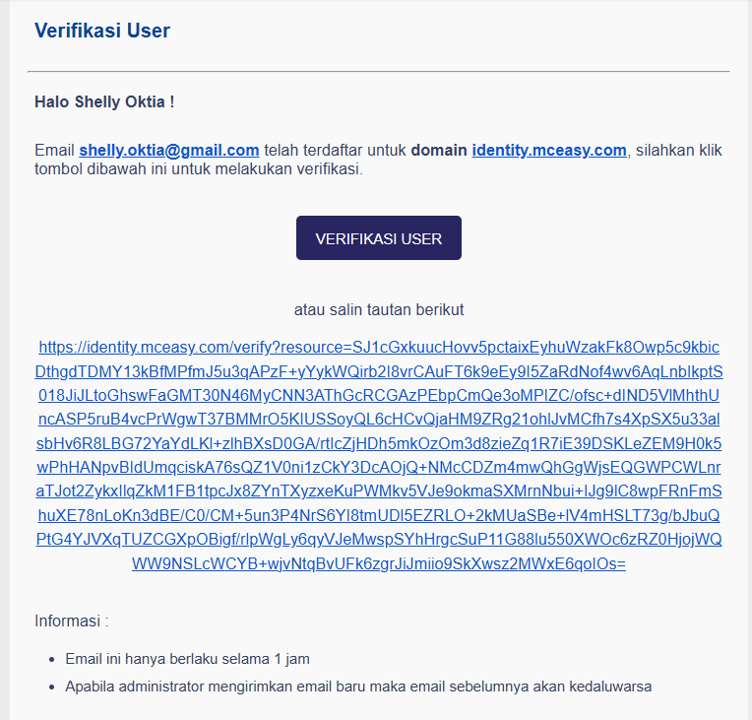 - Jika nanti ada pergantian metode verifikasi, maka link sebelumnya tidak akan bisa digunakan (sebagai contoh, verifikasi pertama melalui whatsapp, kemudian diubah melalui email, maka link terakhir berada di email)