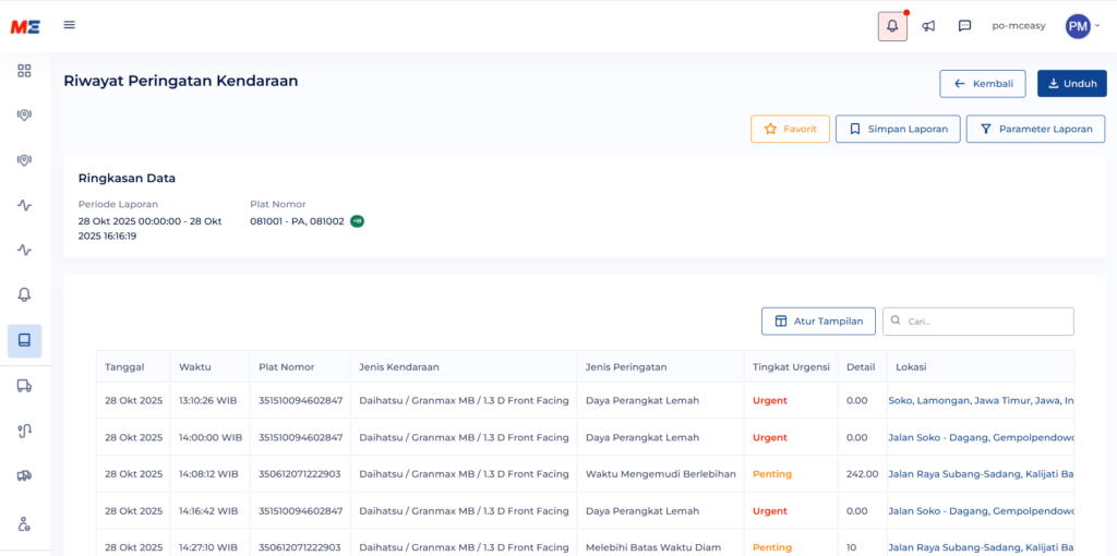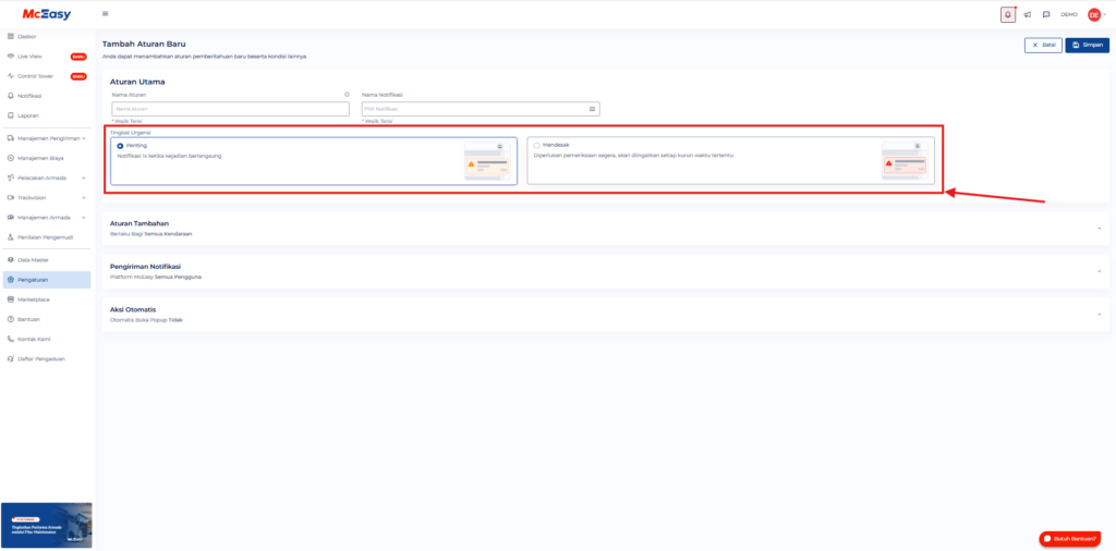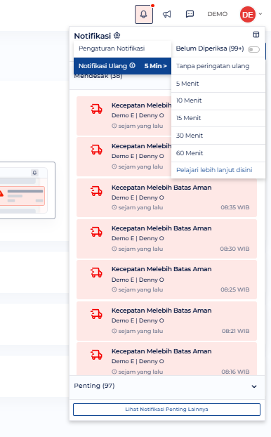 Notifikasi bisa diatur menjadi 2 level; Penting & Urgent. Kedua level ini dapat ditentukan sendiri oleh user di halaman settings — sehingga nantinya akan tampil di Notification Center, Control Tower, dan juga Laporan Peringatan Kendaraan. Notifikasi dengan level urgent bisa diatur untuk berbunyi kembali jika belum diperiksa.